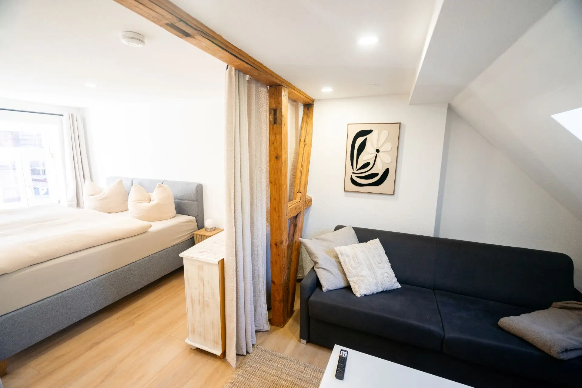 • Schlafzimmer 1: ein Familienzimmer mit Boxspringbett 180 × 200 cm und ausziehbarem Schlafsofa 160 × 200 cm