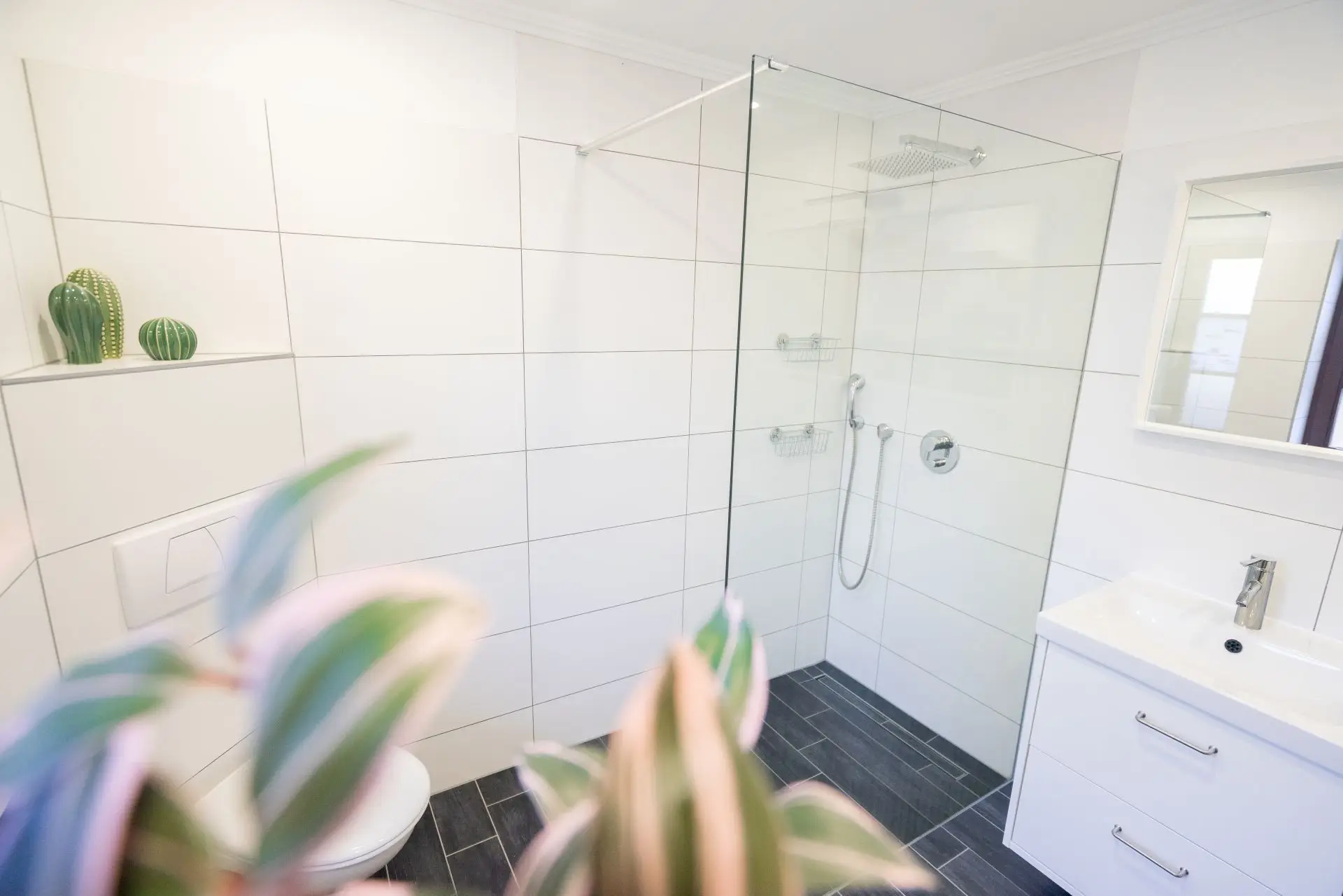 Das moderne Badezimmer ist großzügig gestaltet und bietet mit seiner komfortablen Dusche einen angenehmen Start in den Tag oder entspannte Momente nach einem erlebnisreichen Harztag.