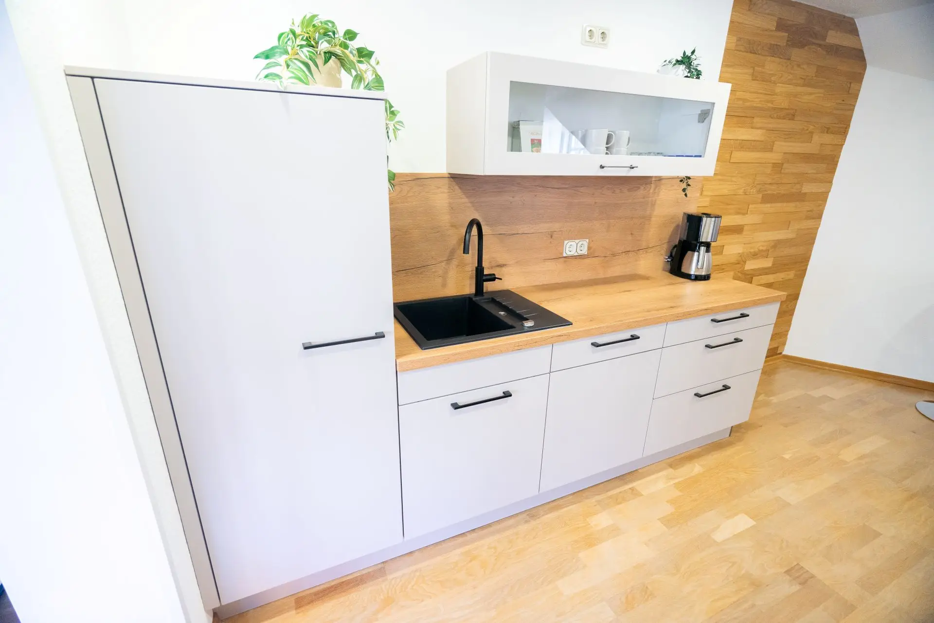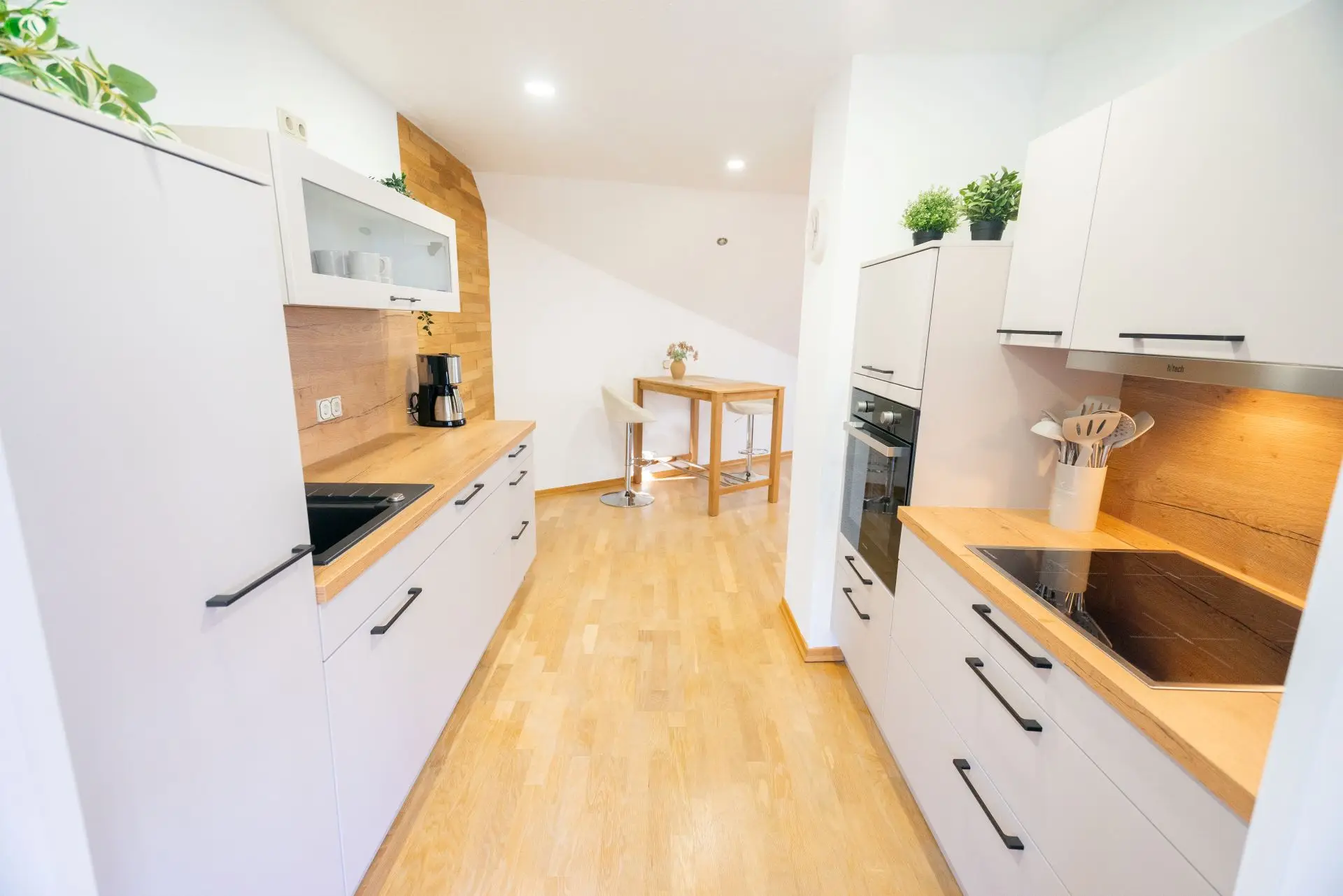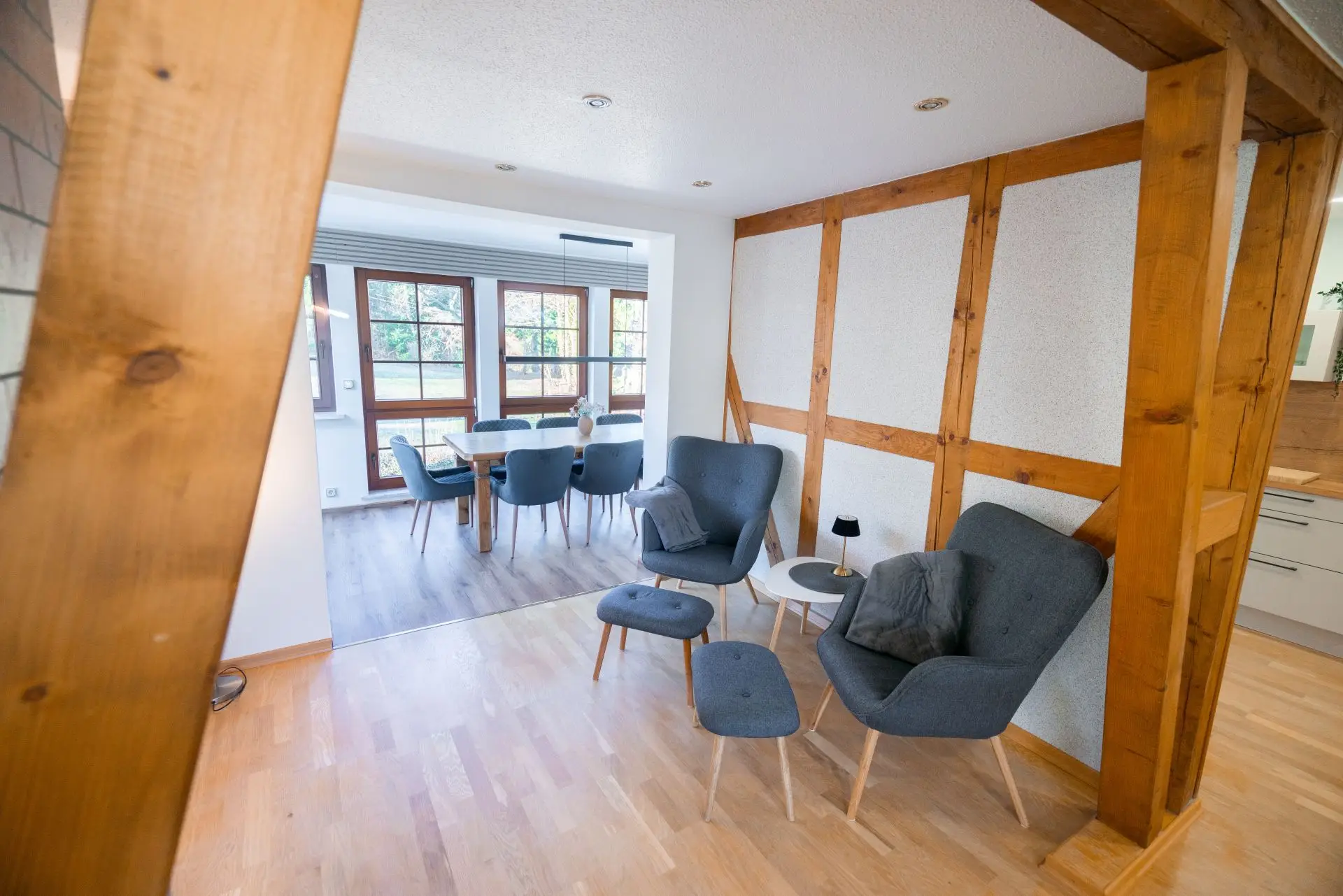 Der große Wohnbereich lädt mit bequemen Sitzmöbeln und viel Freiraum zum Entspannen, Zusammensitzen oder Spieleabenden ein. Die voll ausgestattete Küche bietet beste Voraussetzungen für eine unkomplizierte Selbstversorgung und ausreichend Platz für gemeinsame Mahlzeiten. Ein großer Esstisch bildet dabei den zentralen Treffpunkt der Wohnung.