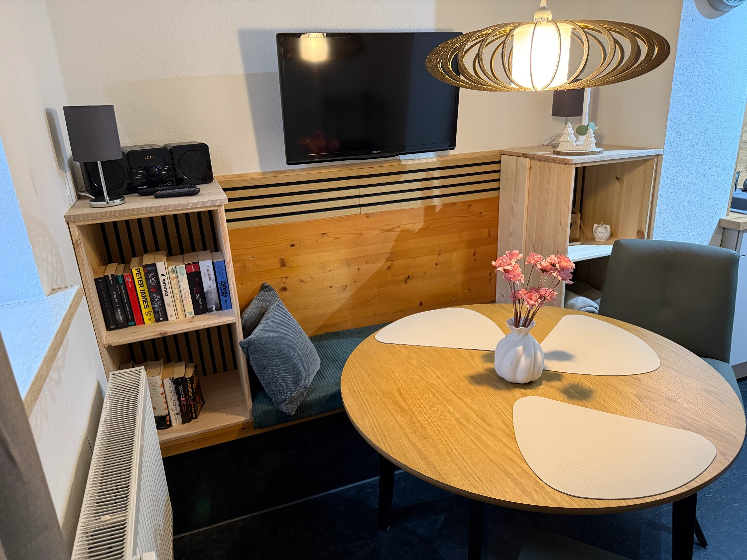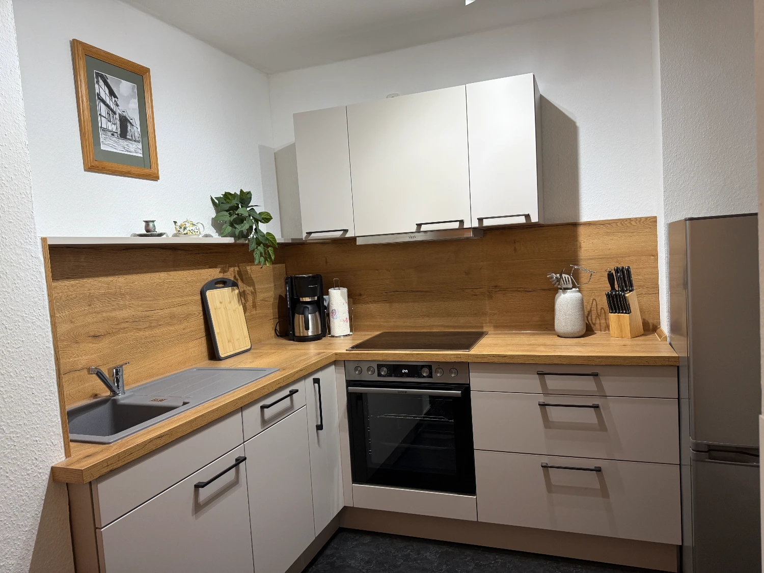 Die gemütliche Wohnküche mit moderner Ausstattung und separater Sitzecke lädt zum Verweilen ein. Das großzügige Schlafzimmer, der offene Wohnbereich und das stilvolle Bad mit ebenerdiger Regendusche bieten entspanntes Wohlfühlen.