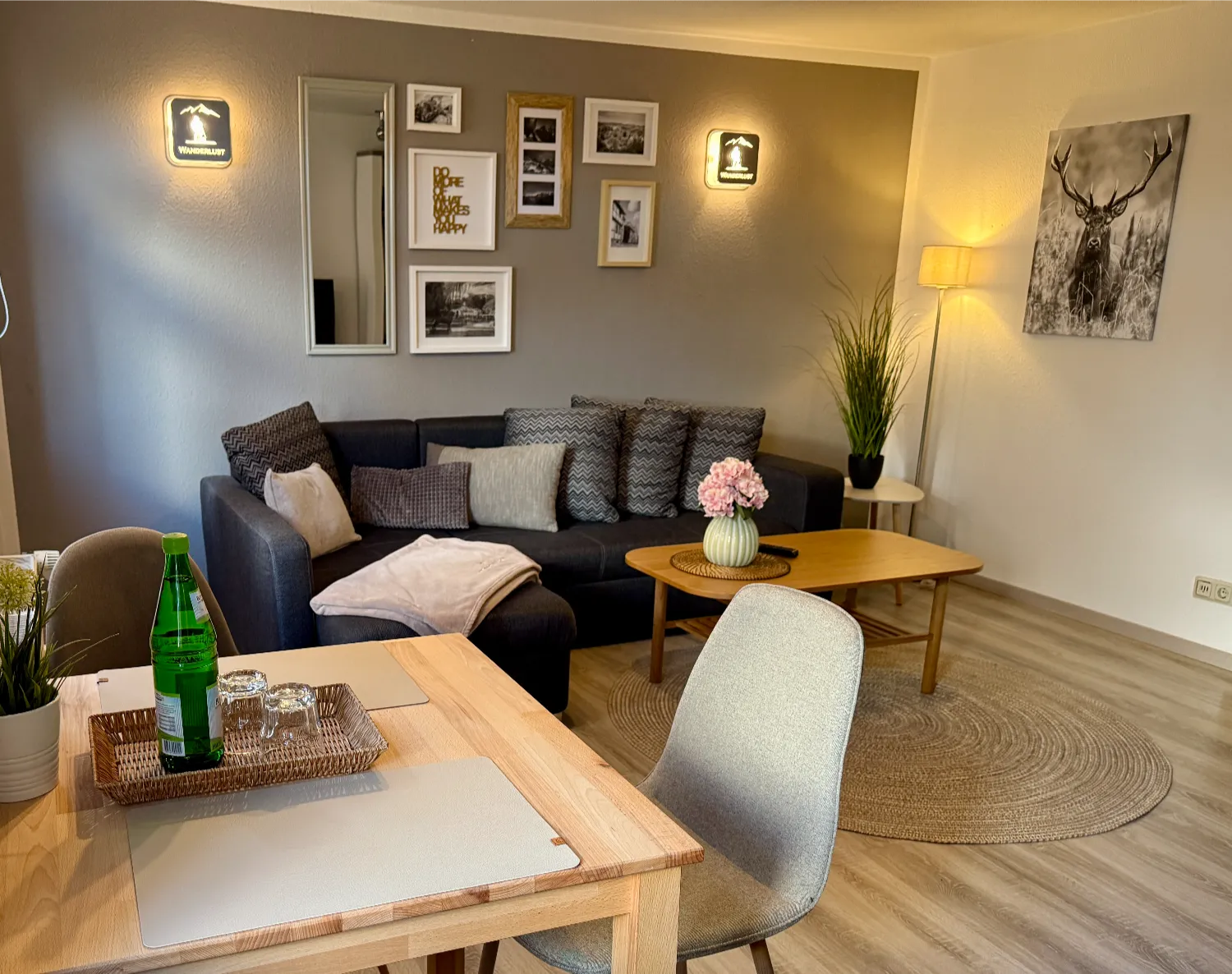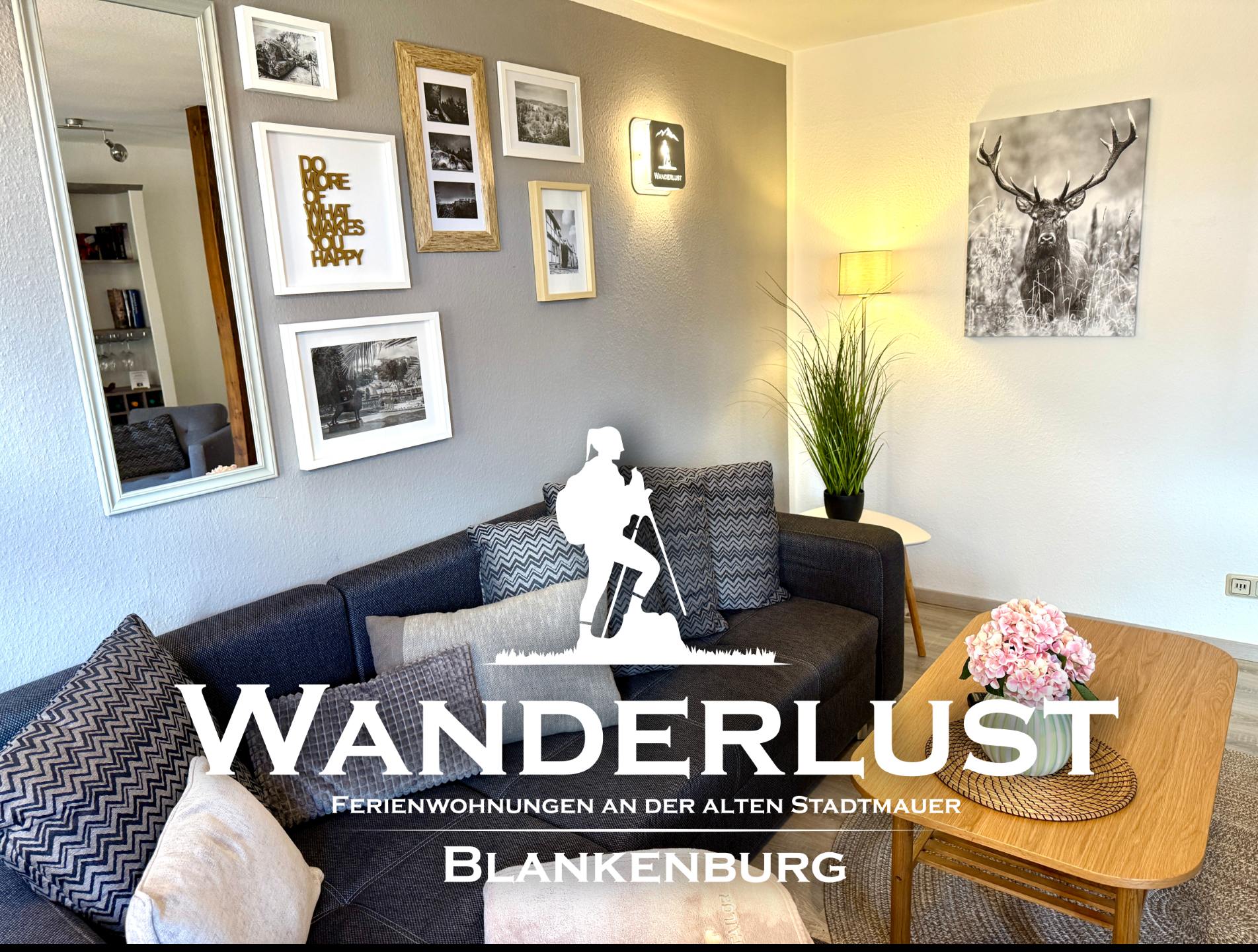 Unsere Ferienwohnung Wanderlust ist der ideale Rückzugsort nach einem Tag voller Erlebnisse im Harz. Das Wohnzimmer mit sichtbaren Fachwerkbalken versprüht historischen Charme und bietet einen gemütlichen Essbereich mit Esstisch für drei Personen. Im Schlafzimmer sorgt ein komfortables Boxspringbett für erholsame Nächte.