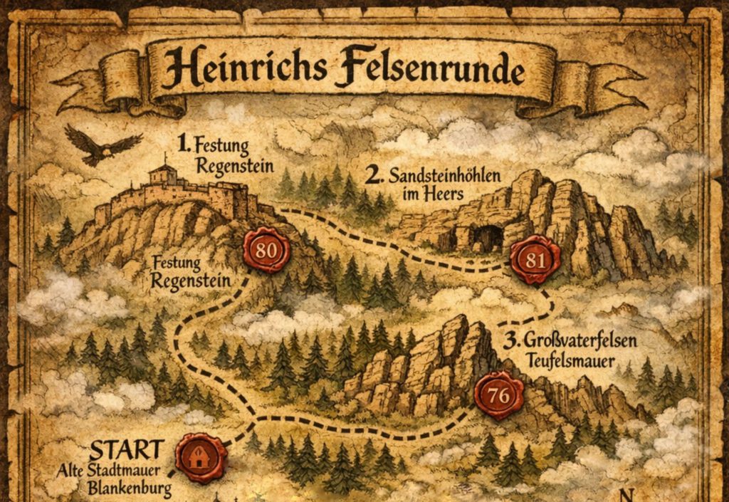 Länge: ca. 10 km Dauer: 3–3,5 Stunden Höhenmeter: ca. 220 m Start: Altstadt Blankenburg / Stadtmauer Krumme Straße Highlights: Festung Regenstein, Sandhöhlen, Teufelsmauer, Großvaterfelsen Start – Alte Stadtmauer Blankenburg zur Festung Regenstein 3,7 km | ca. 60 Minuten | ca. +90 hm Festung Regenstein Stempelstelle Nr. 80 zu den Sandsteinhöhlen 1,9 km | ca. 30 […]