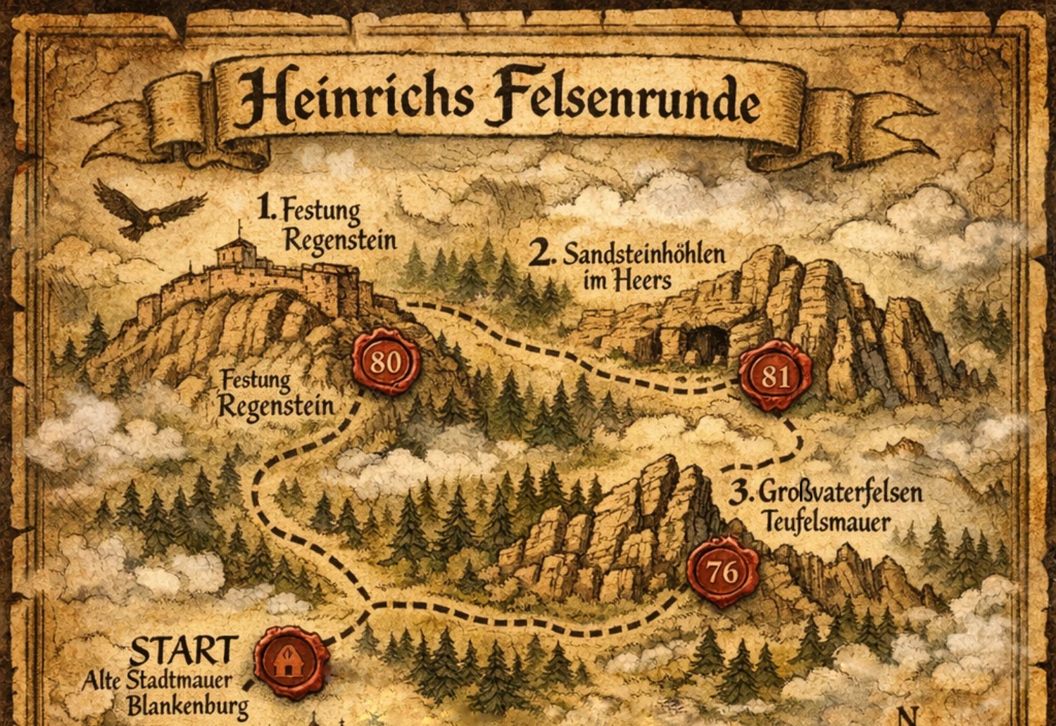 - Highlights: Festung Regenstein, Sandhöhlen, Teufelsmauer, Großvaterfelsen